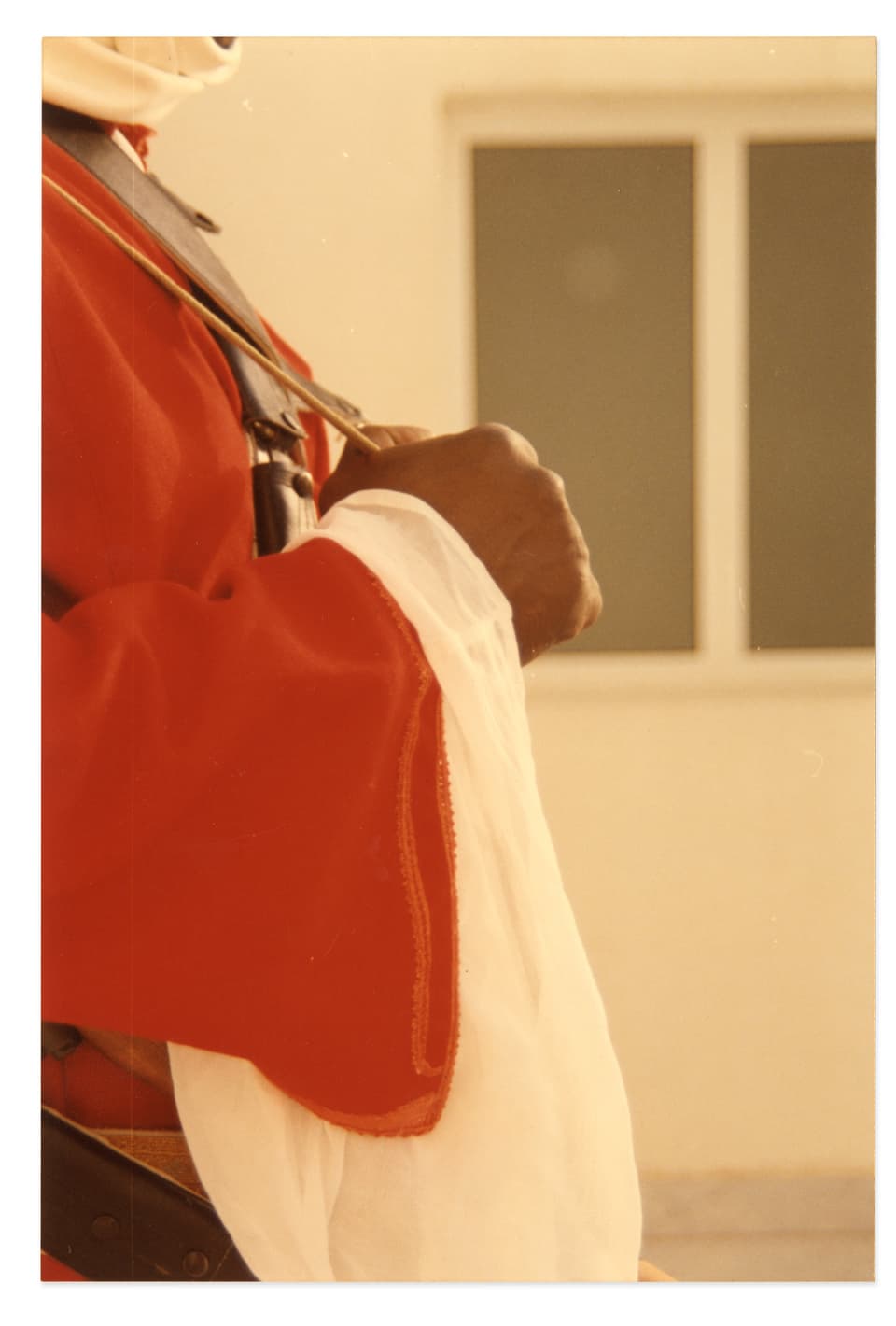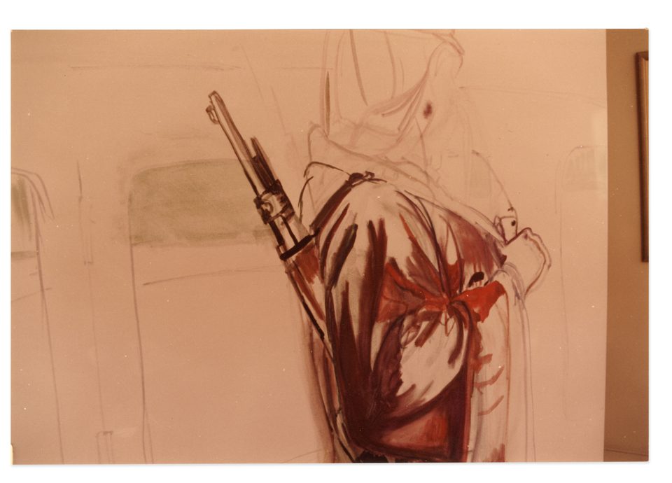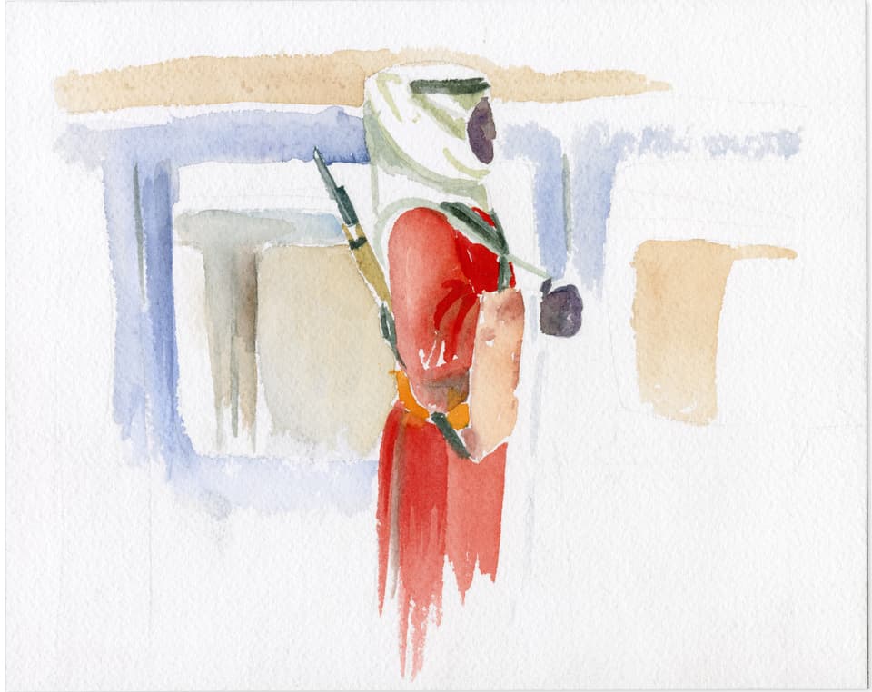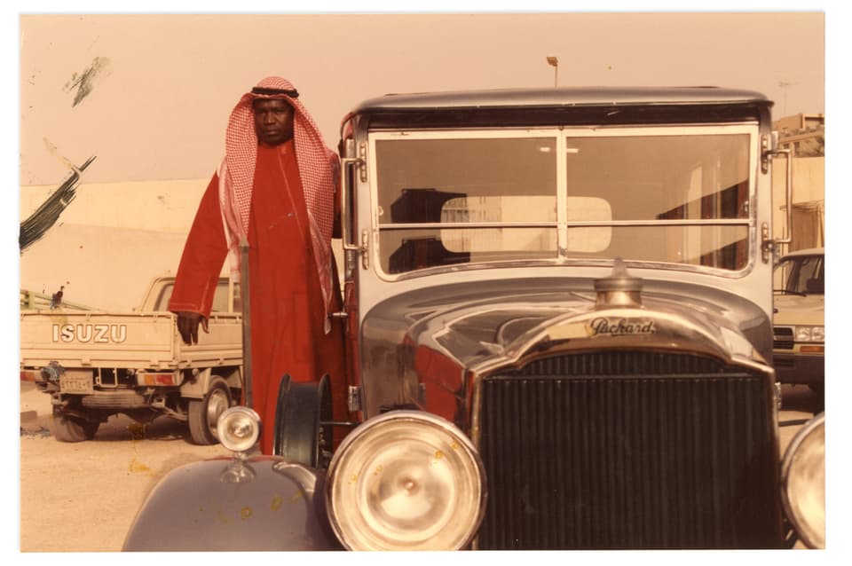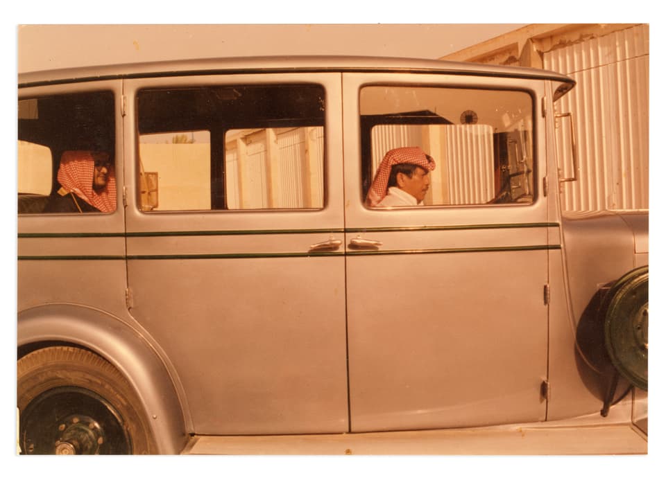 - HallaOld footage of Saudi Arabia’s founding king visiting Bahrain showed guards standing on the runners of the royal car. My father explained that this was how they used to bulletproof vehicles in those days—with human shields. I was fascinated and horrified and wanted to capture the moment. A friend’s uncle was a car collector and, incredibly, happened to have one of the king’s old Rolls-Royces in his garage. Her brother posed as the king, my driver as the driver, and I found a man who looked like the one in the footage to stand on the runner in full costume. I was so taken by his face that I forgot to depict his feet, so it’s not clear that he’s meant to be standing on a moving vehicle.